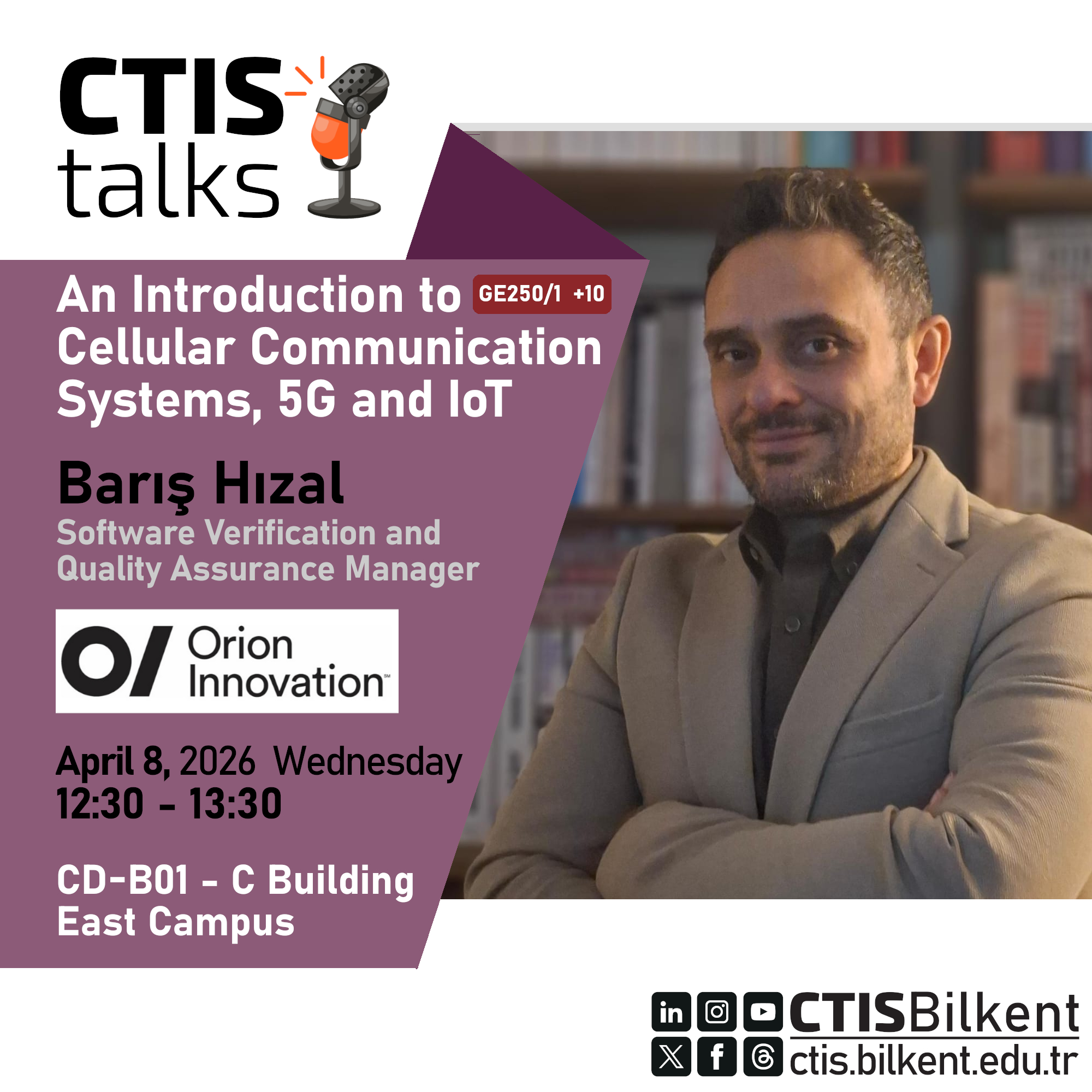 Seminar: "An Introduction to Cellular Communication Systems, 5G and IoT" by Barış Hızal, Software Verification and Quality Assurance Manager, Orion Innovation. Apr. 08, 2026 at 12:30-13.30, in CD-B01