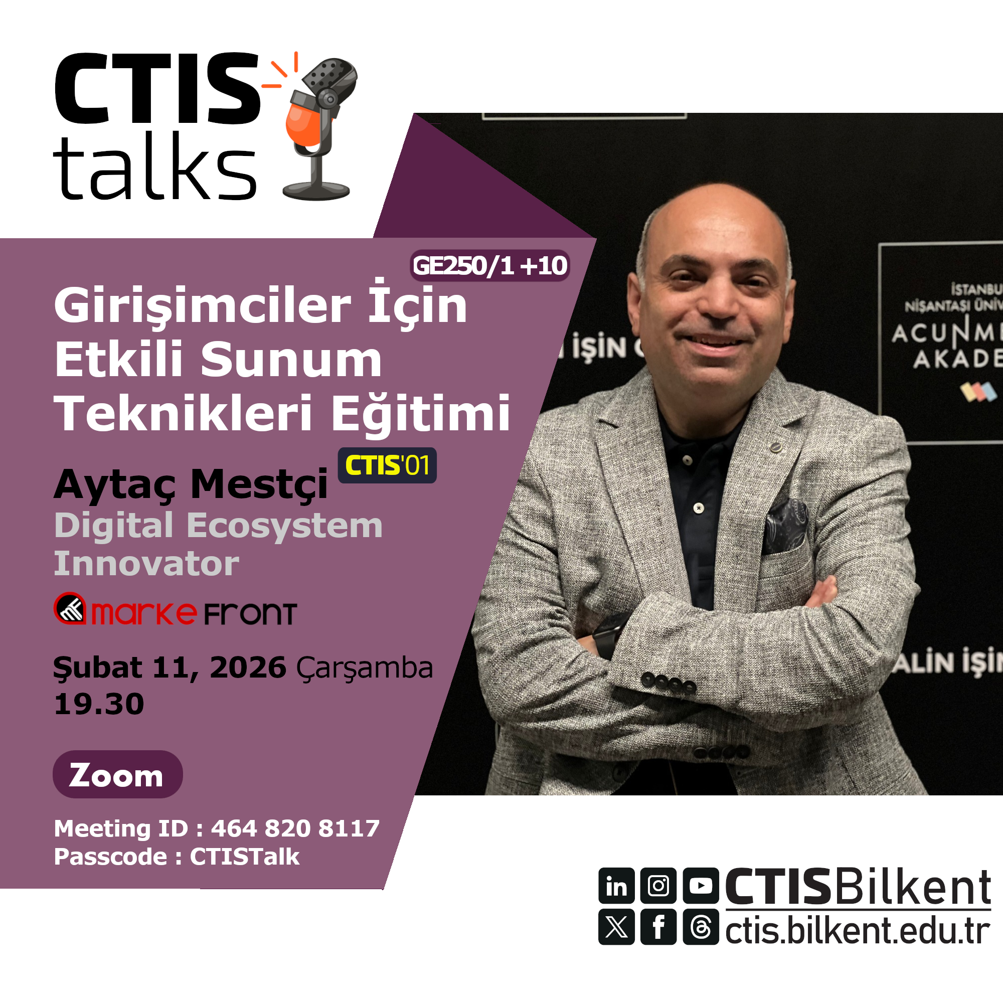 Seminar: "Girişimciler İçin Etkili Sunum Teknikleri Eğitimi" by Aytaç Mestçi, Digital Ecosystem Innovator, MarkeFront. Feb. 11, 2026 at 19:30, via Zoom