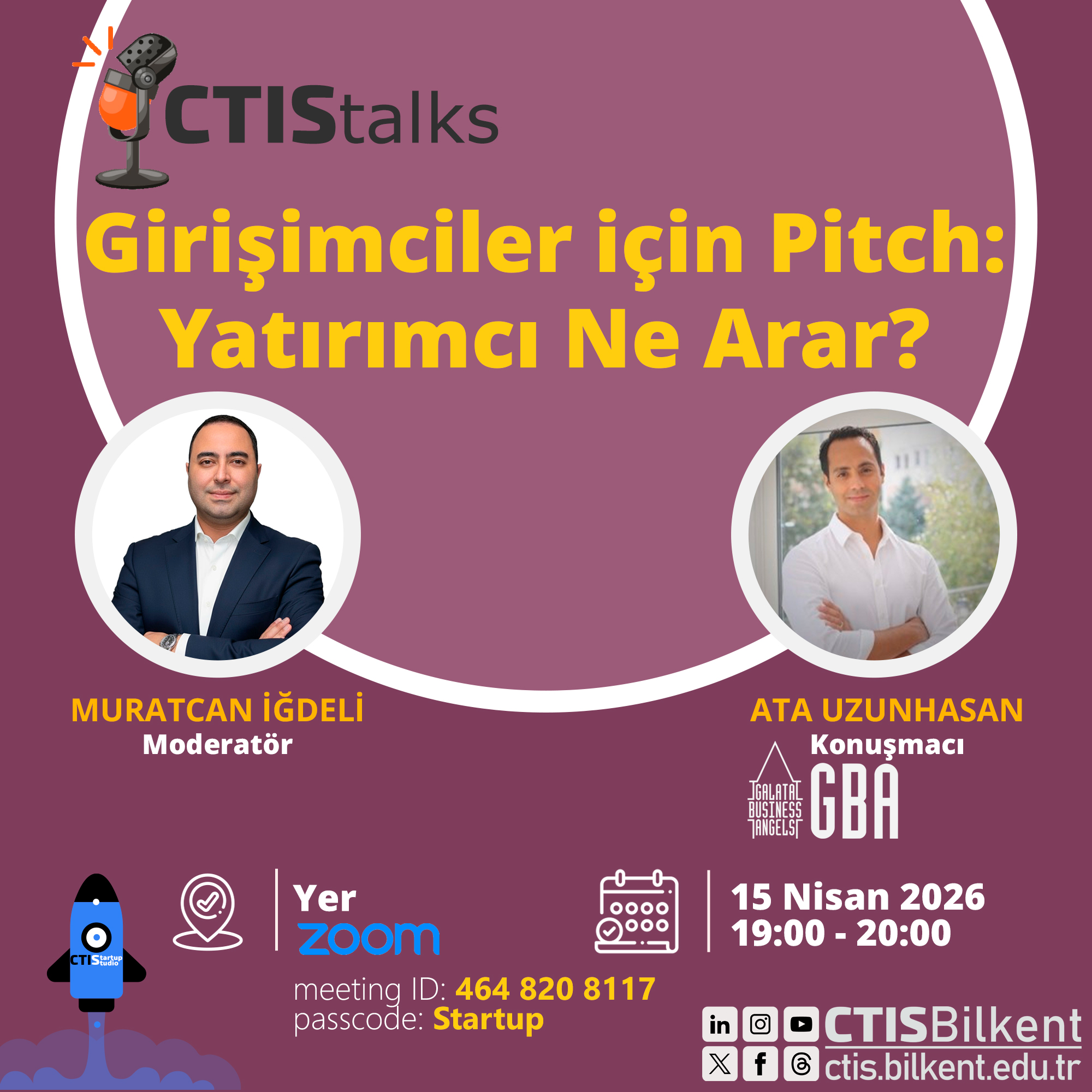 Seminar: "Girişimciler için Pitch: Yatırımcı ne Arar?" by Ata Uzunhasan, Moderatör: Muratcan İğdeli, GBA. Apr. 15, 2026 at 19:00, via Zoom